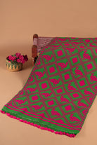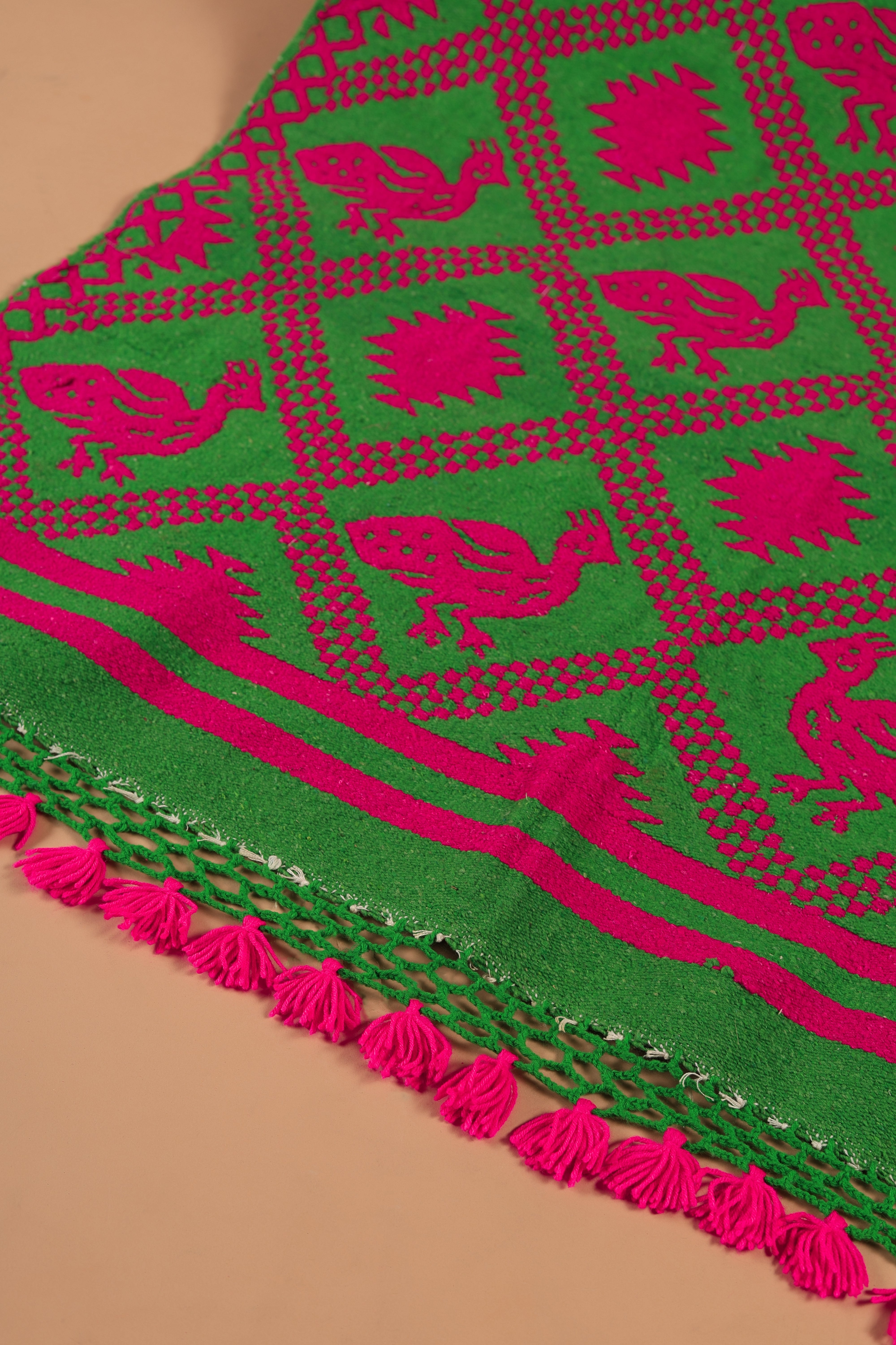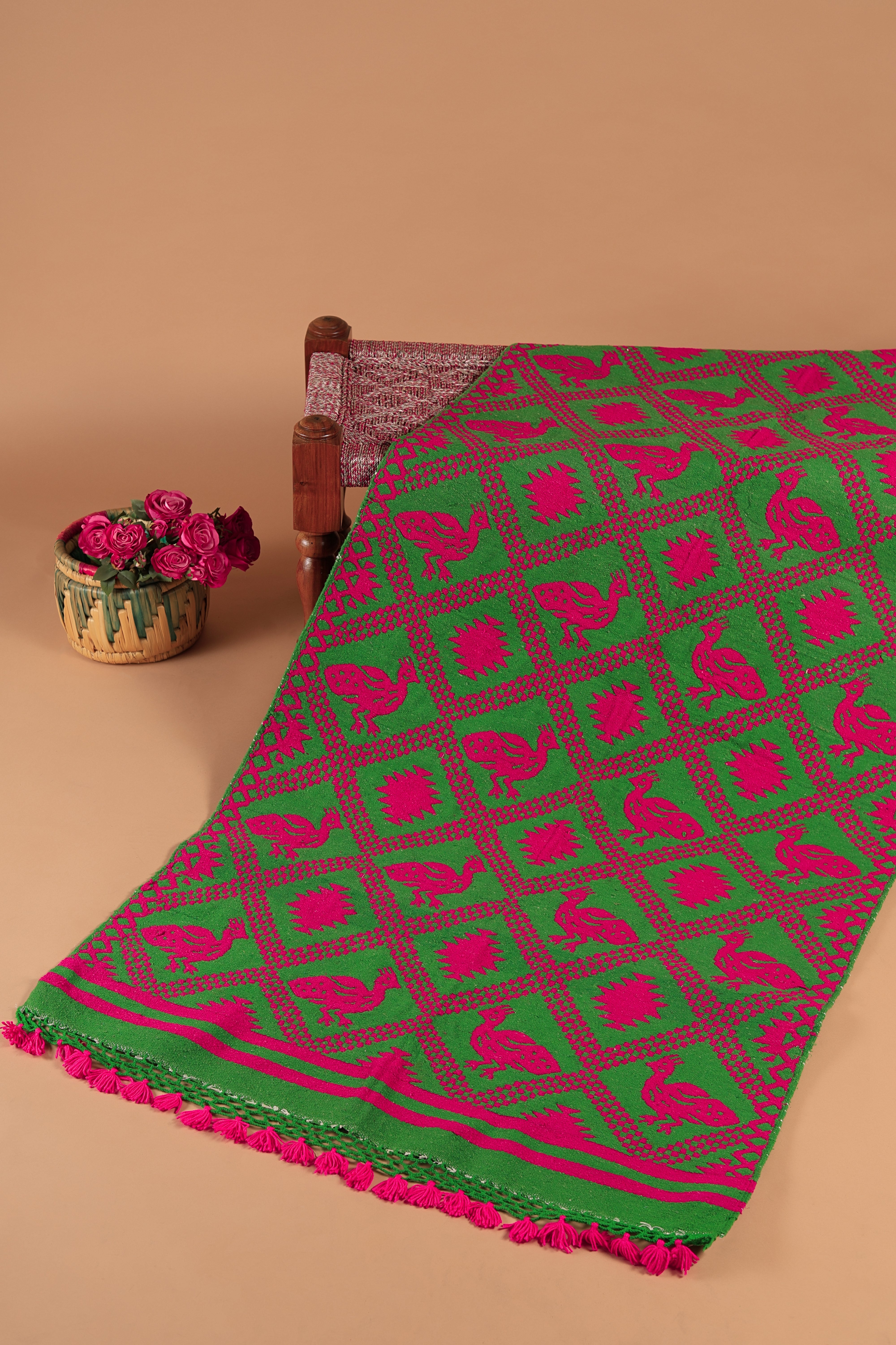 Handwoven vintage rug in vivid emerald green and fuchsia, featuring a repeating square grid of stylised bird and rosette motifs in a buti-style repeat. This handcrafted piece brings bold, joyful colour — use it as a statement runner, throw, or wall hanging.