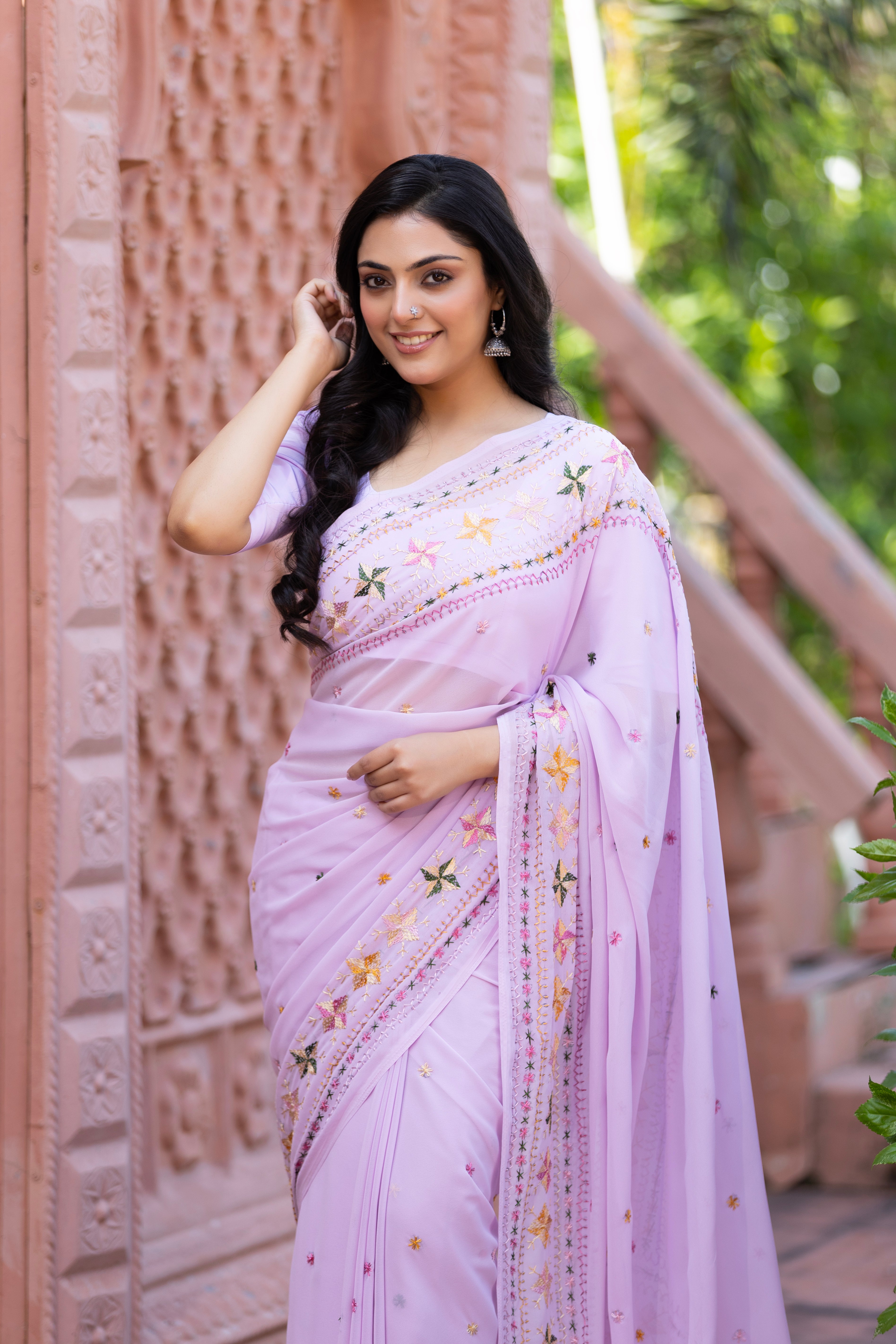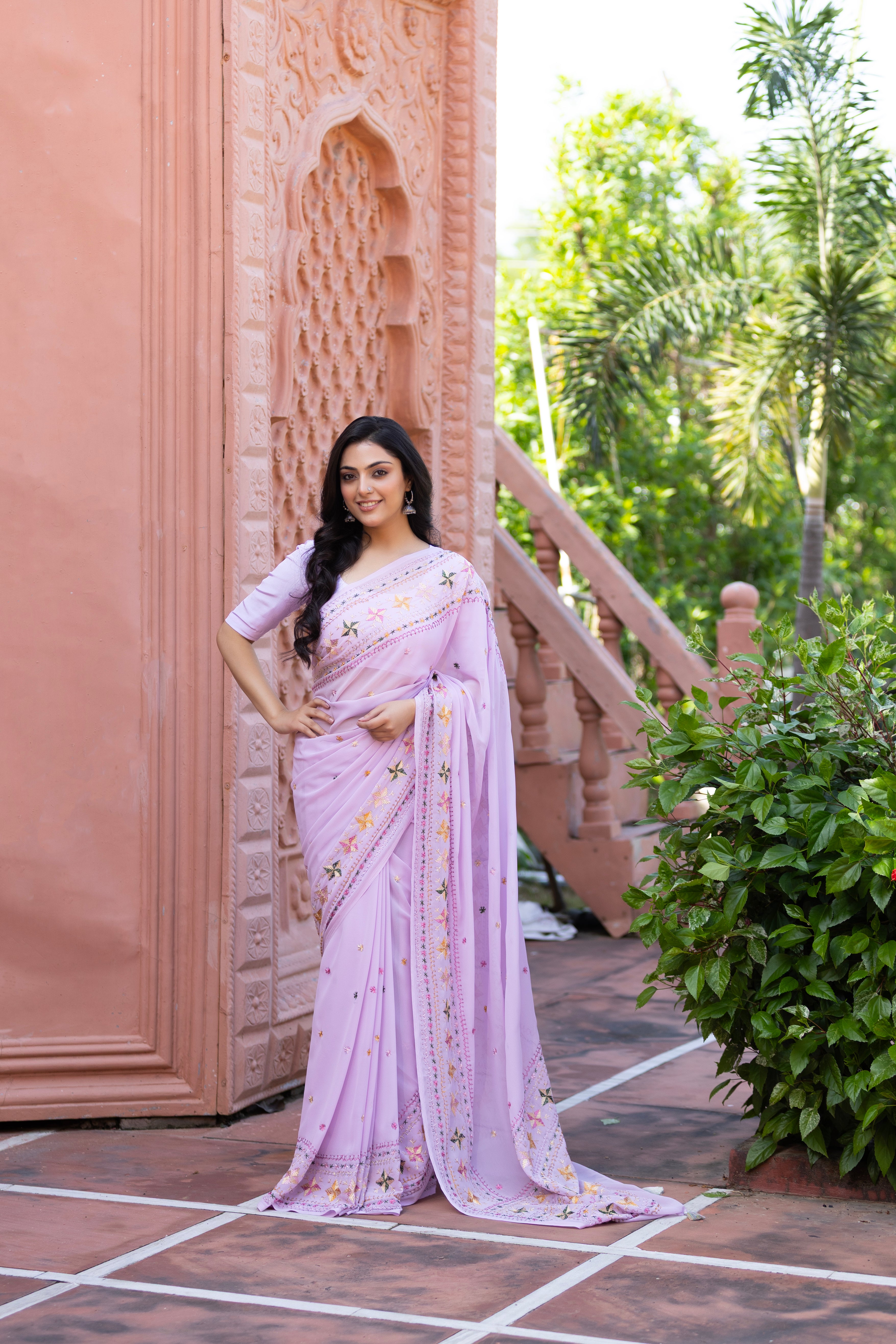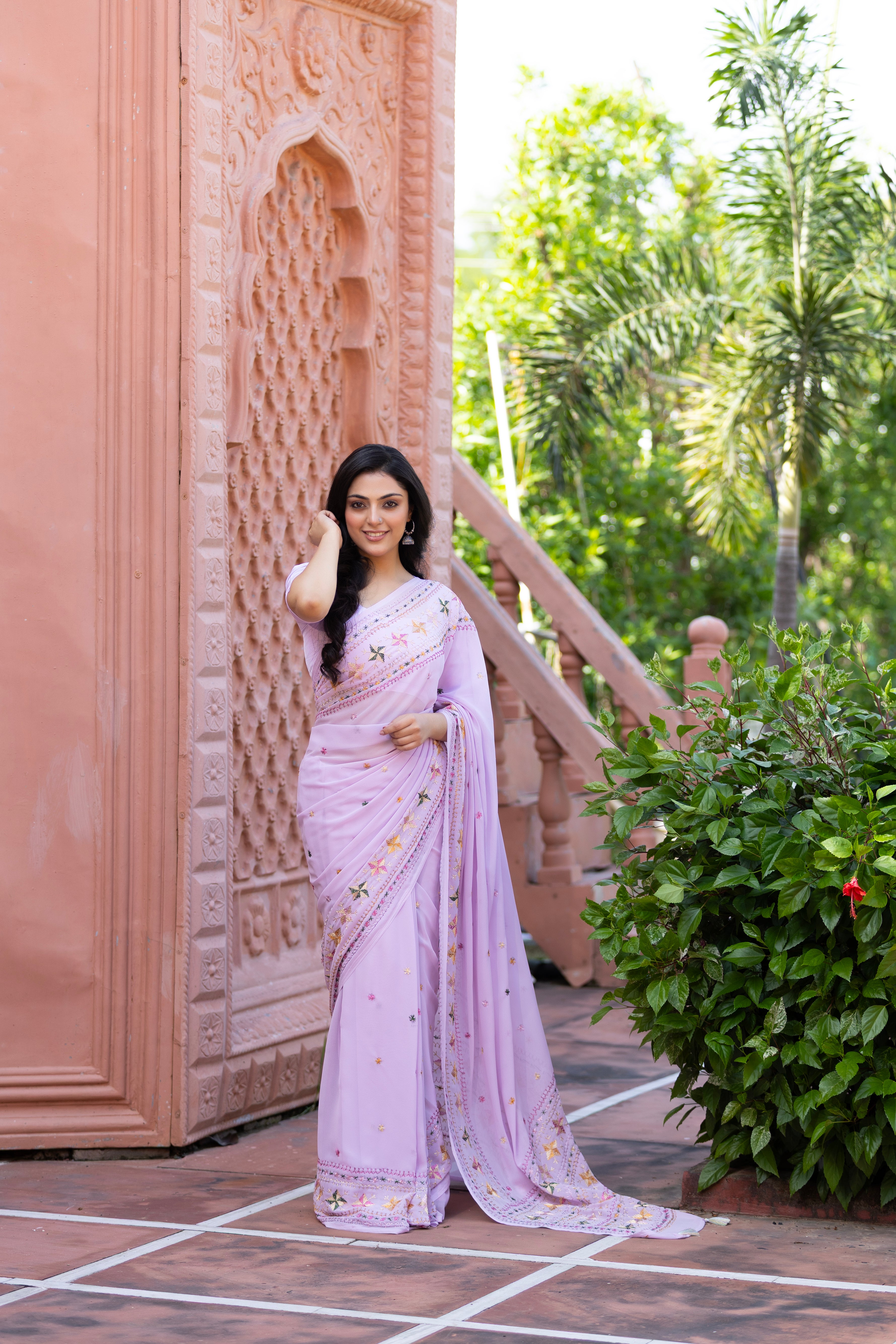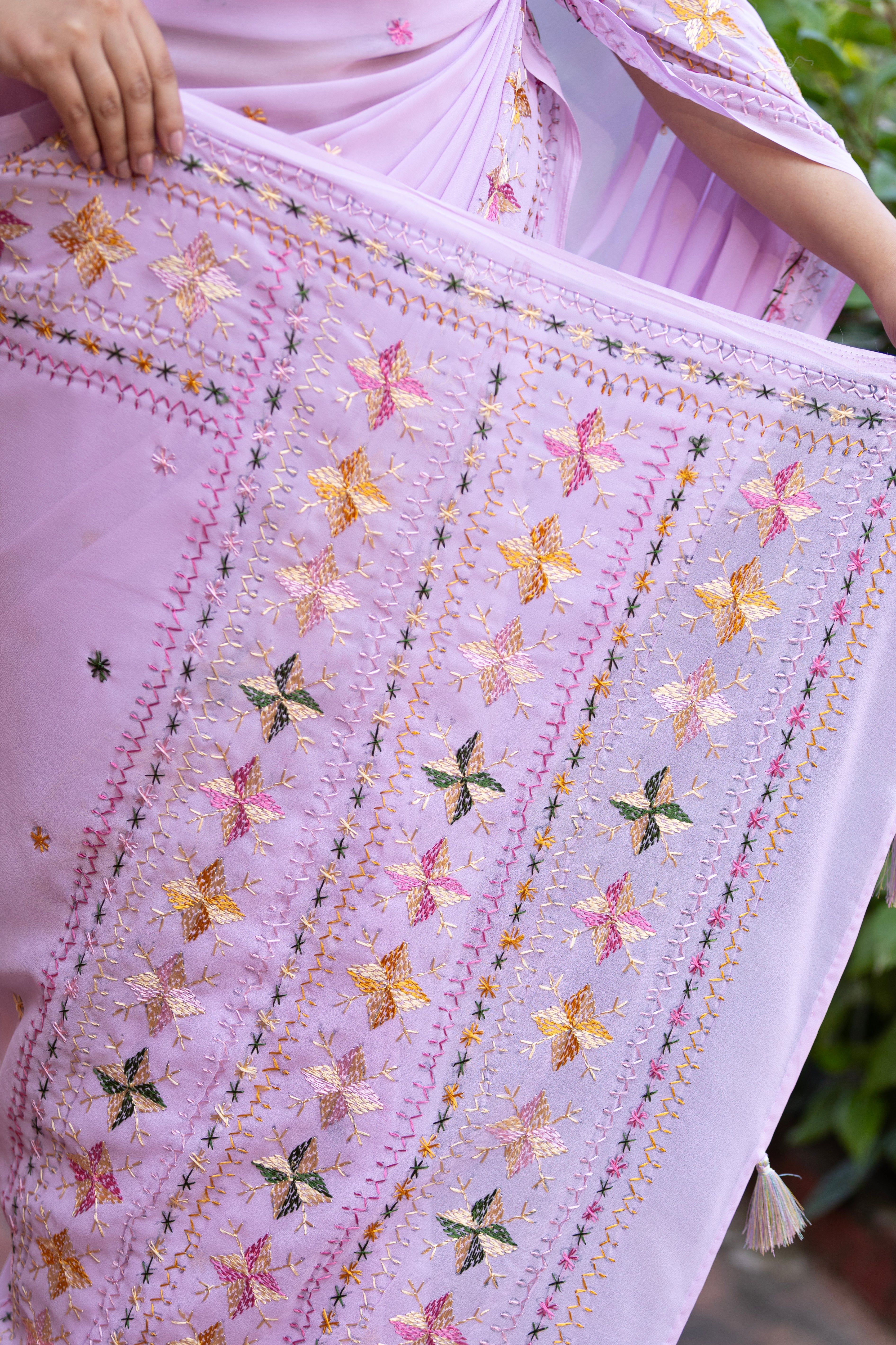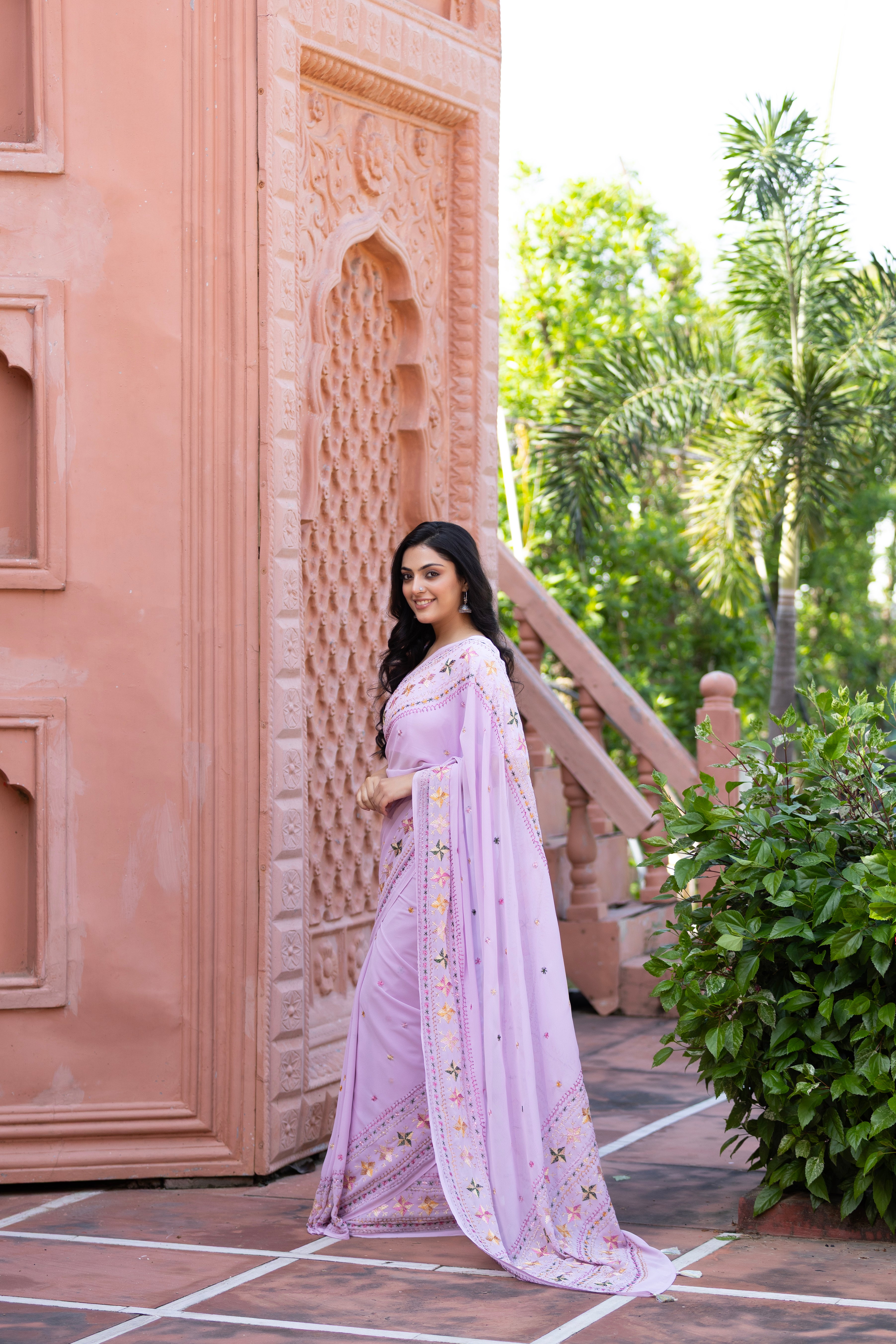 This lavender saree is a celebration of heritage and Indian craftsmanship, adorned with delicate hand-embroidered floral motifs. Each stitch reflects the artistry of traditional Punjabi embroidery, blending softness and grace into a timeless drape that speaks of handmade elegance.