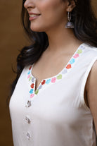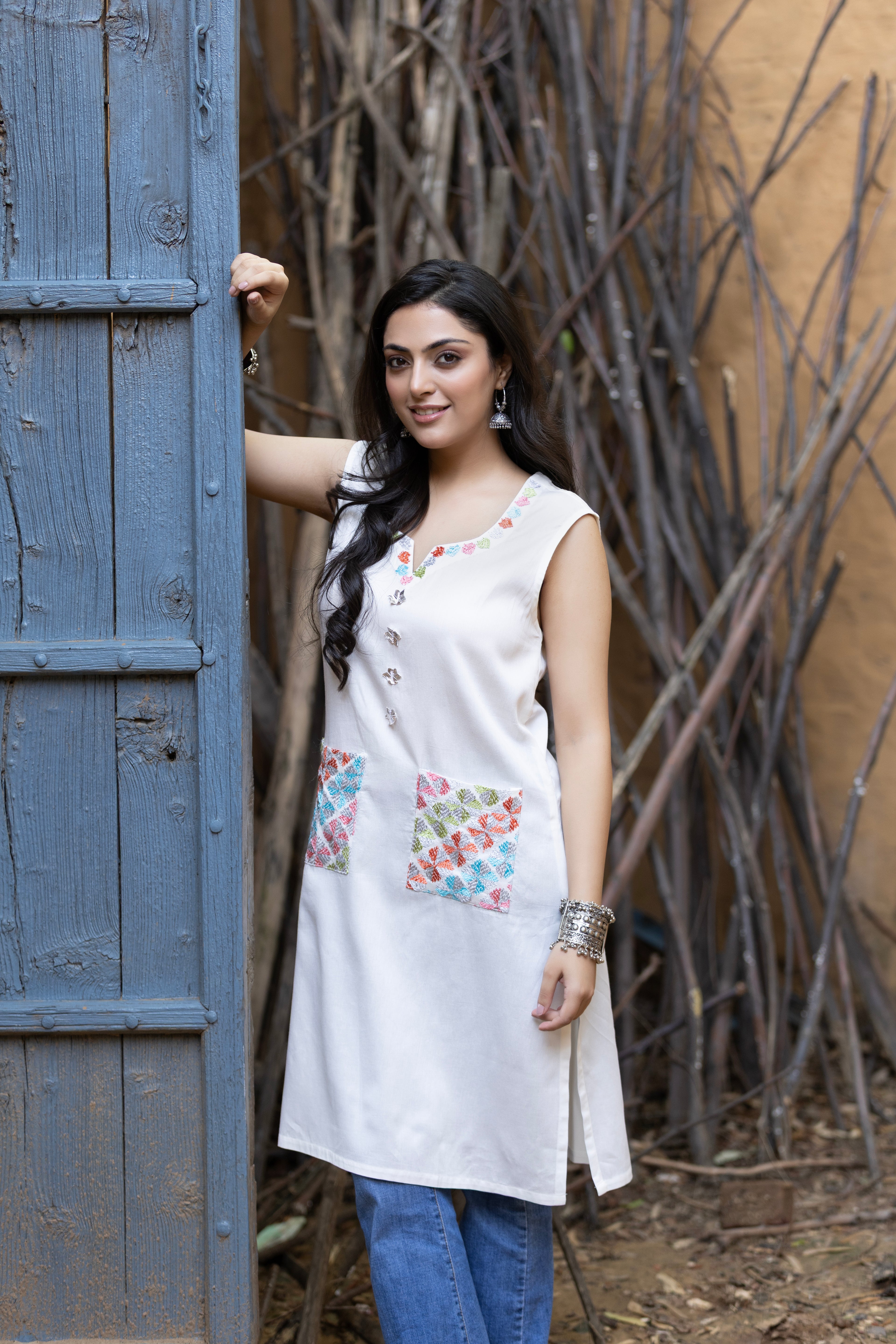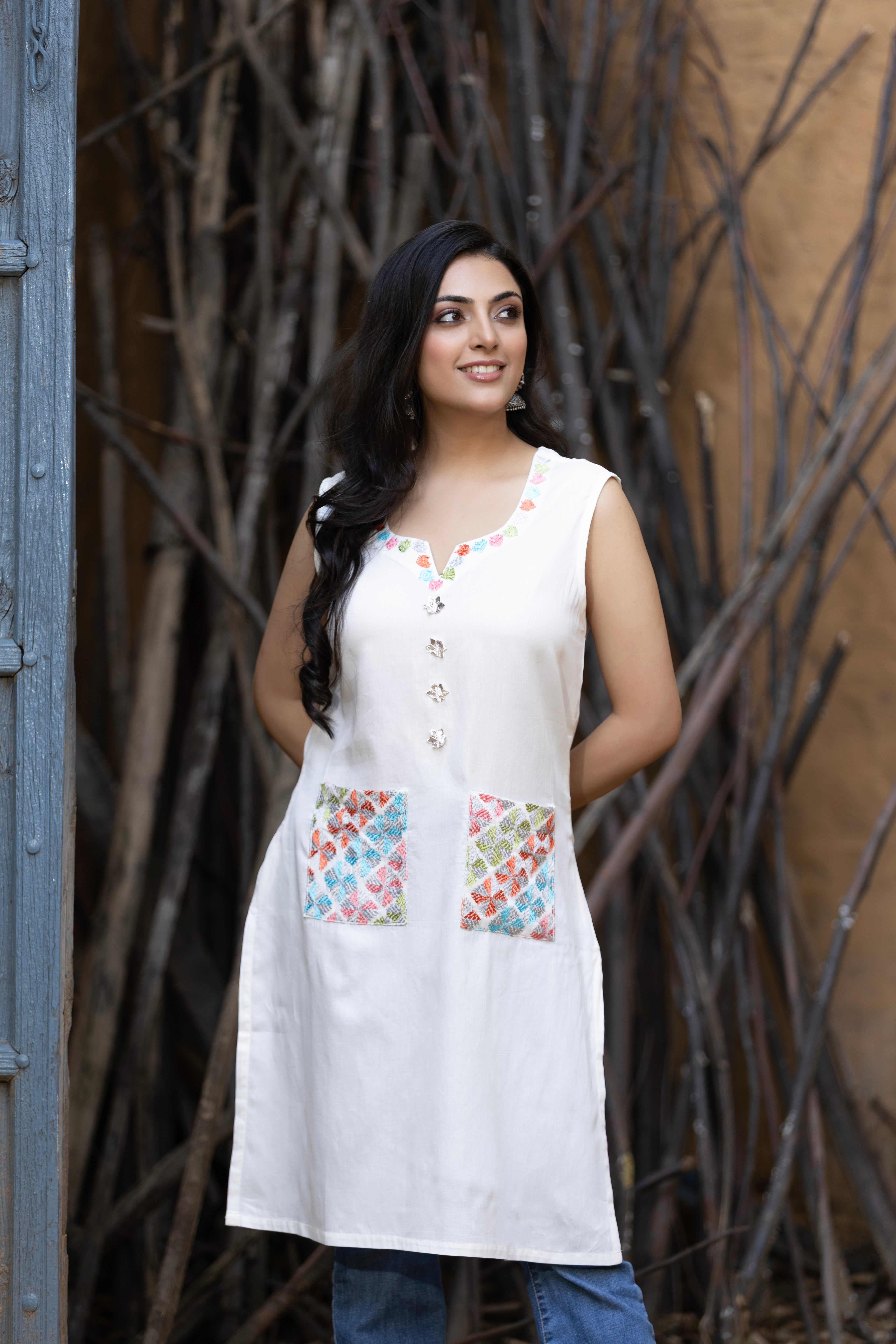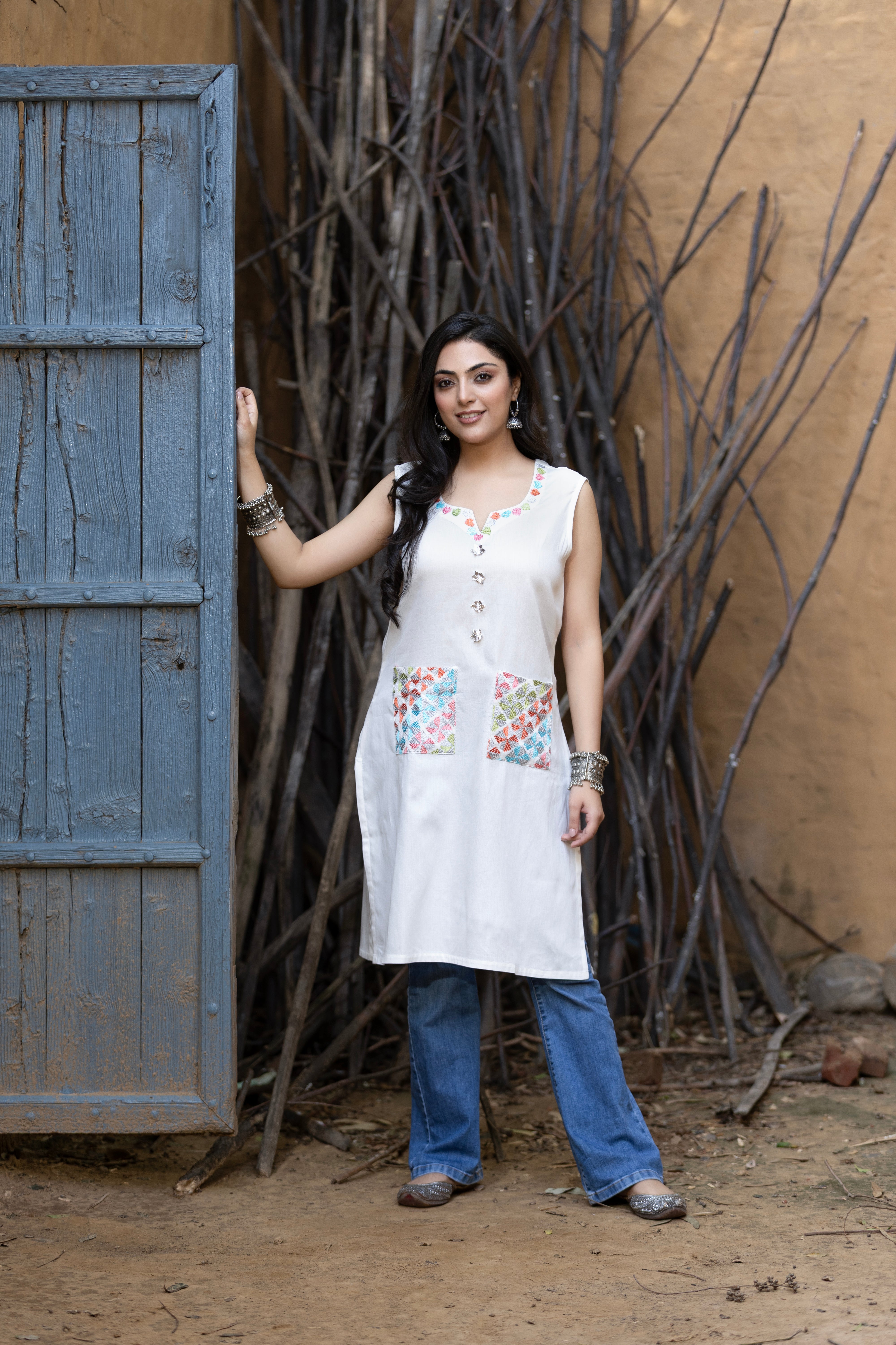 Phulkari White Pocket Kurta