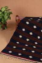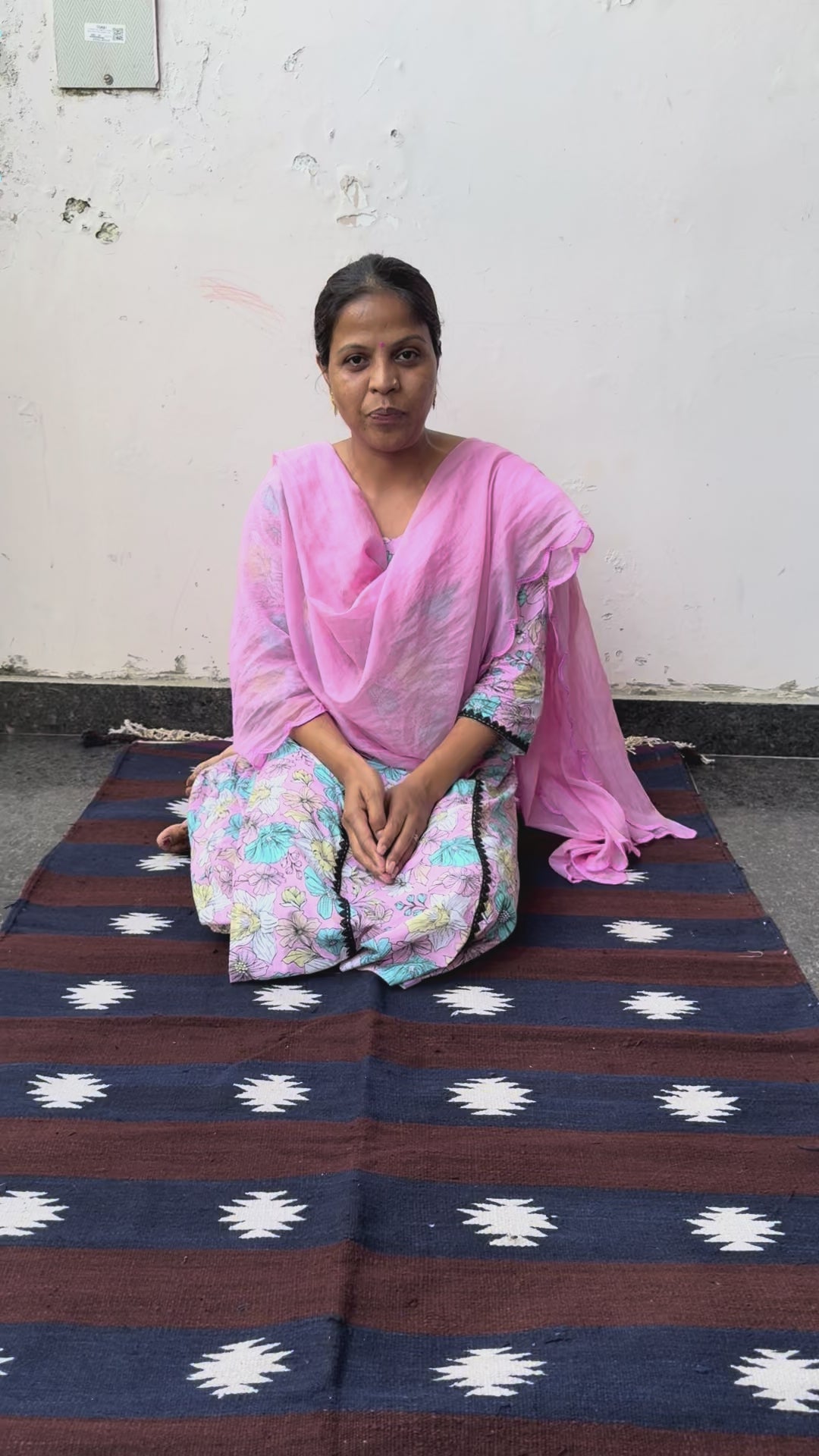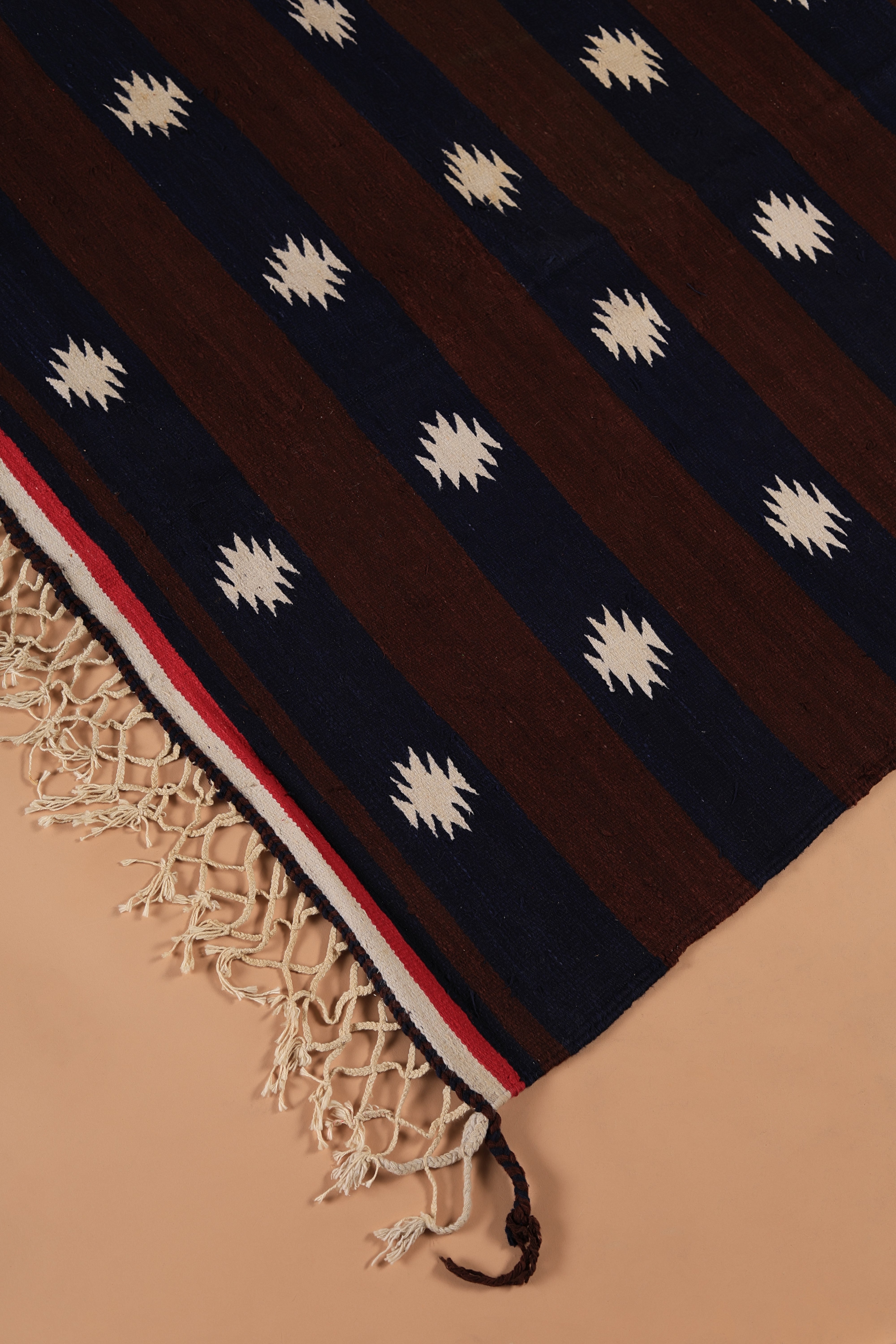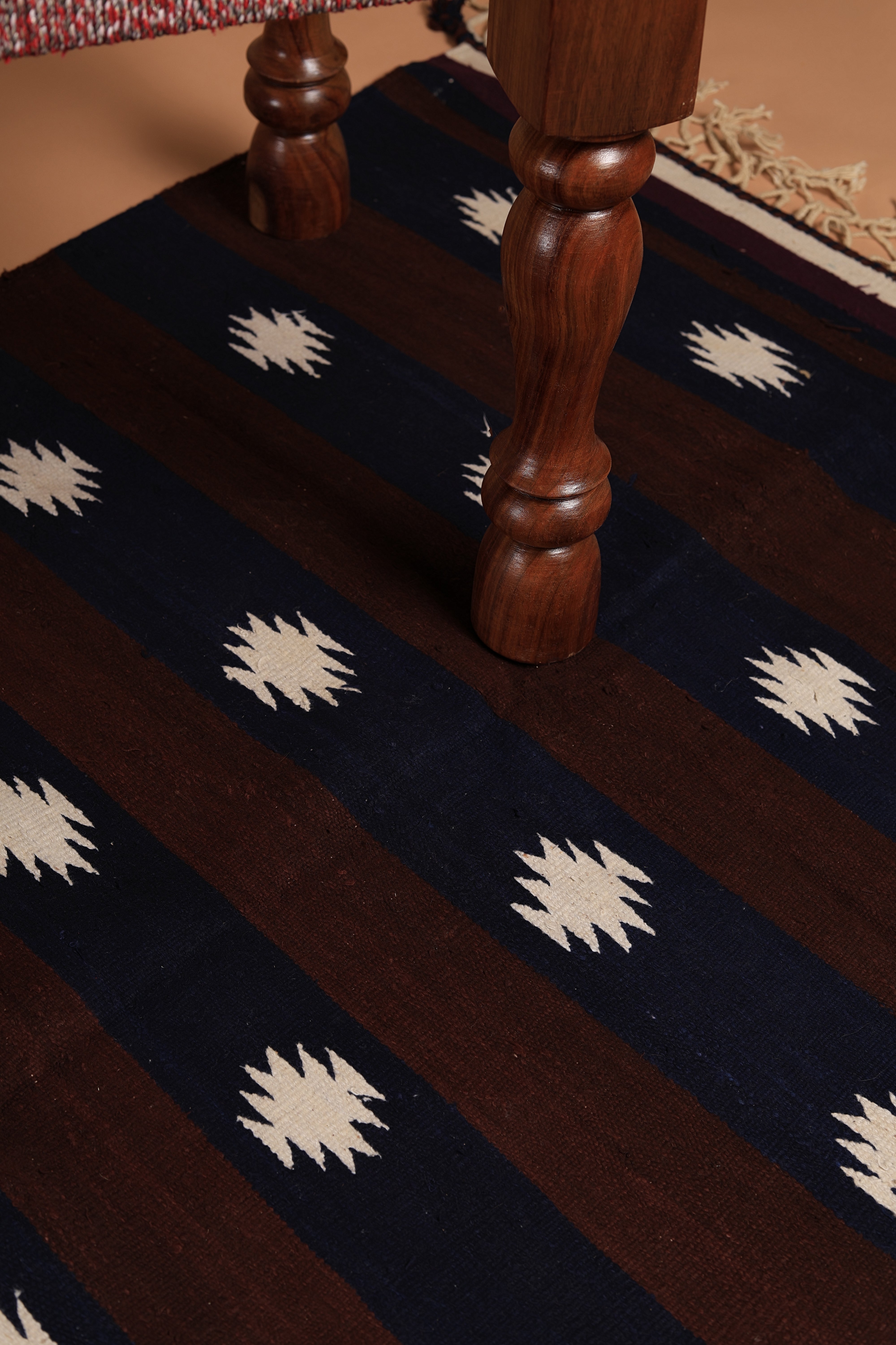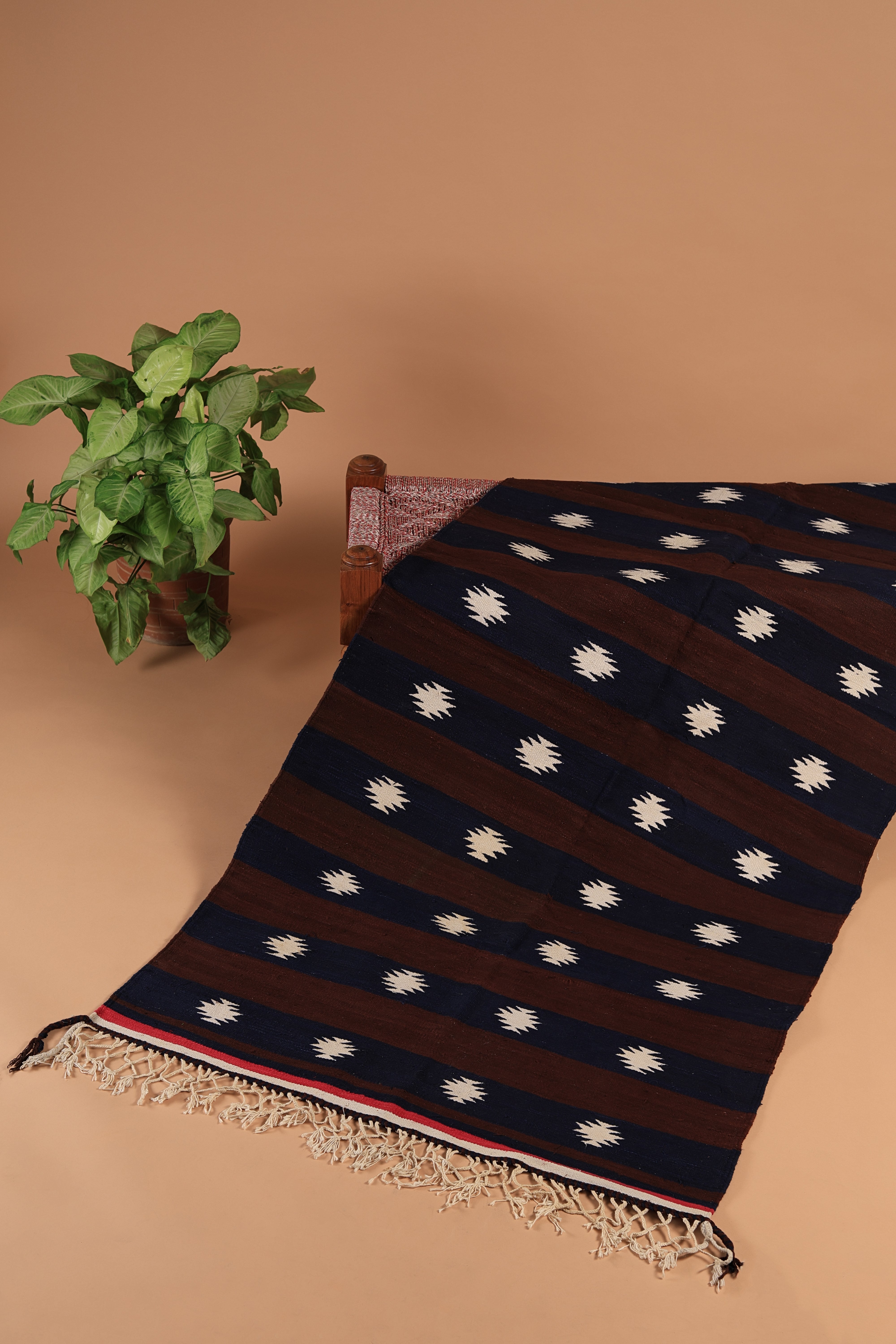 Handwoven in a classic dhurrie flatweave, this vintage rug pairs onyx and chestnut bands with ivory serrated buti motifs, showcasing skilled threadwork and tactile rhythm. Handmade by the late Nani of the artist for her wedding, it carries warmth, memory, and tradition. Perfect as a runner, under a coffee table, or layered over a neutral jute.