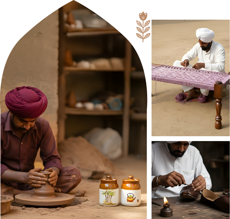 All our products are made with precision and love by skilled, passionate artisans who help us bring our vision to life. For generations, they have carried the art deep in their hearts, preserving the essence and history of Punjab. Every thread, carving, and brush stroke reflects their respect and pure admiration for age-old traditions. Remember, when you buy a product from us, you carry home a piece of Punjab, wrapped in purpose and made with love.